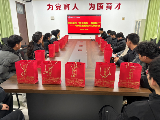 冬日送暖,研途相伴。为缓解考研学子备考压力、传递学院关怀,12月8日,机电学院在万林大楼524会议室开展“研途有你,温暖同行”——考研送温暖慰问关怀活动。机电学院党委副书记朱帅,毕业班辅导员张鑫老师与志愿者一同为即将踏上考场的考研学子送上暖心助力。