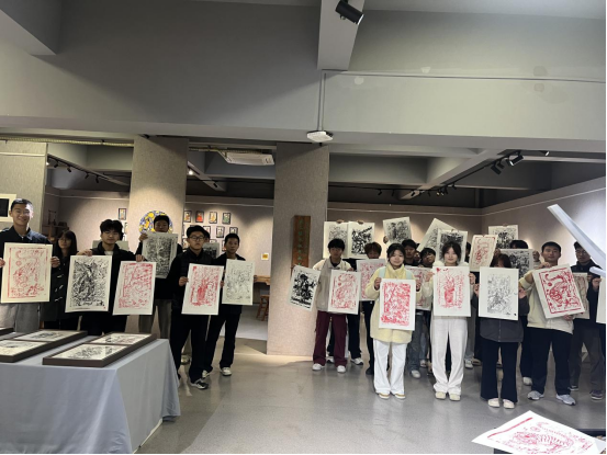 在木版年画互动体验区,同学们纷纷上手体验,他们仔细把握拓包的力度,细心调节颜料的均匀度,每个人都专注地完成着属于自己的那一份独特作品。在互动过程中,同学们让一幅幅亲手制作的年画成为民族团结的鲜活载体,让非遗技艺在实践中传递文化力量。
